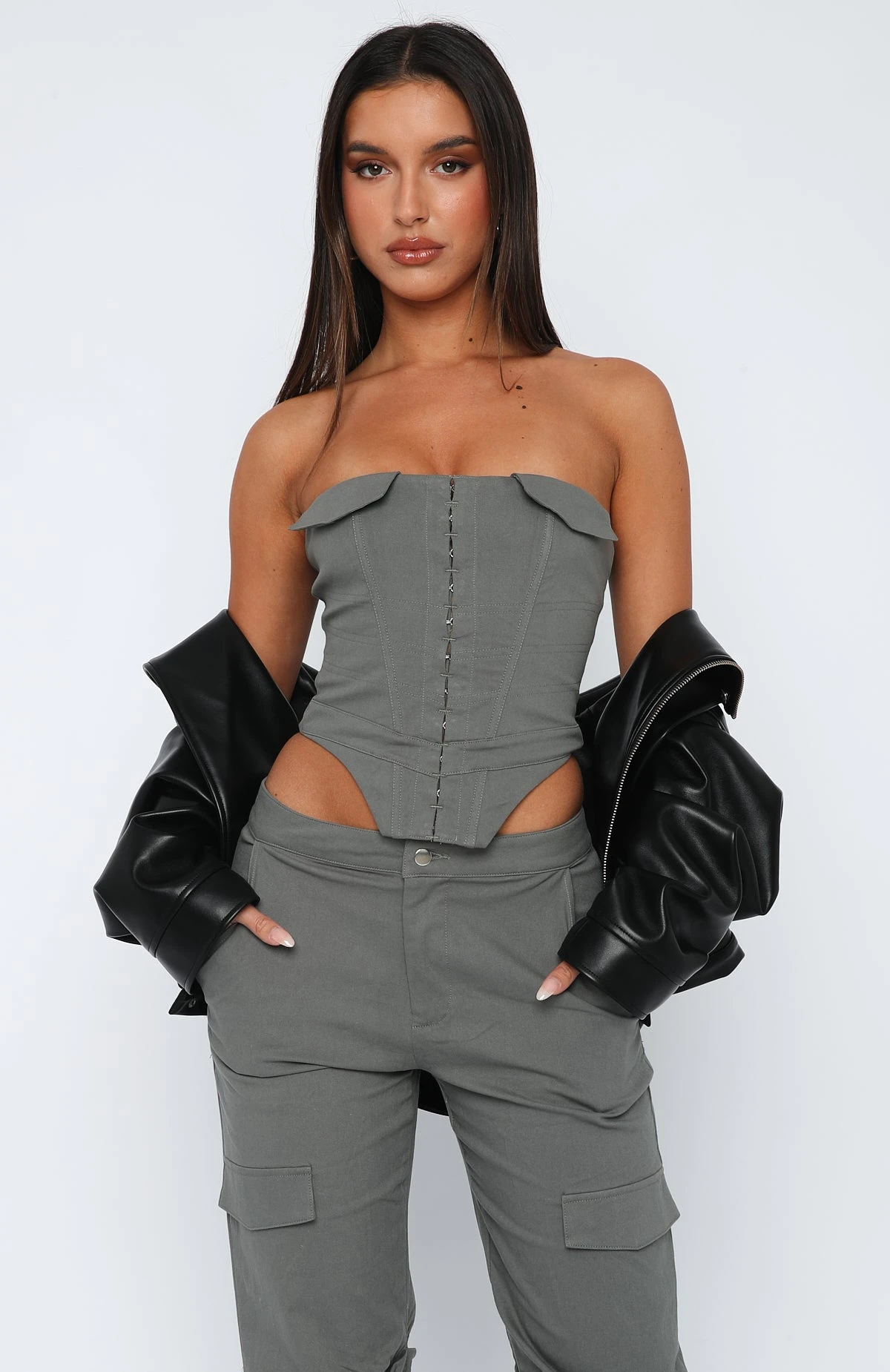 This set is fun and flirty! This confidence-enhancing Bad For Me Bustier in Slate is perfect for all your weekend needs. This strapless bustier features boning in bodice, zipper centre back, hook and eye front design, cargo pocket detail and lined fabric. Style with Living Easy Pants, clear heels, and a mini bag for a ‘fit worthy of all your weekend plans.