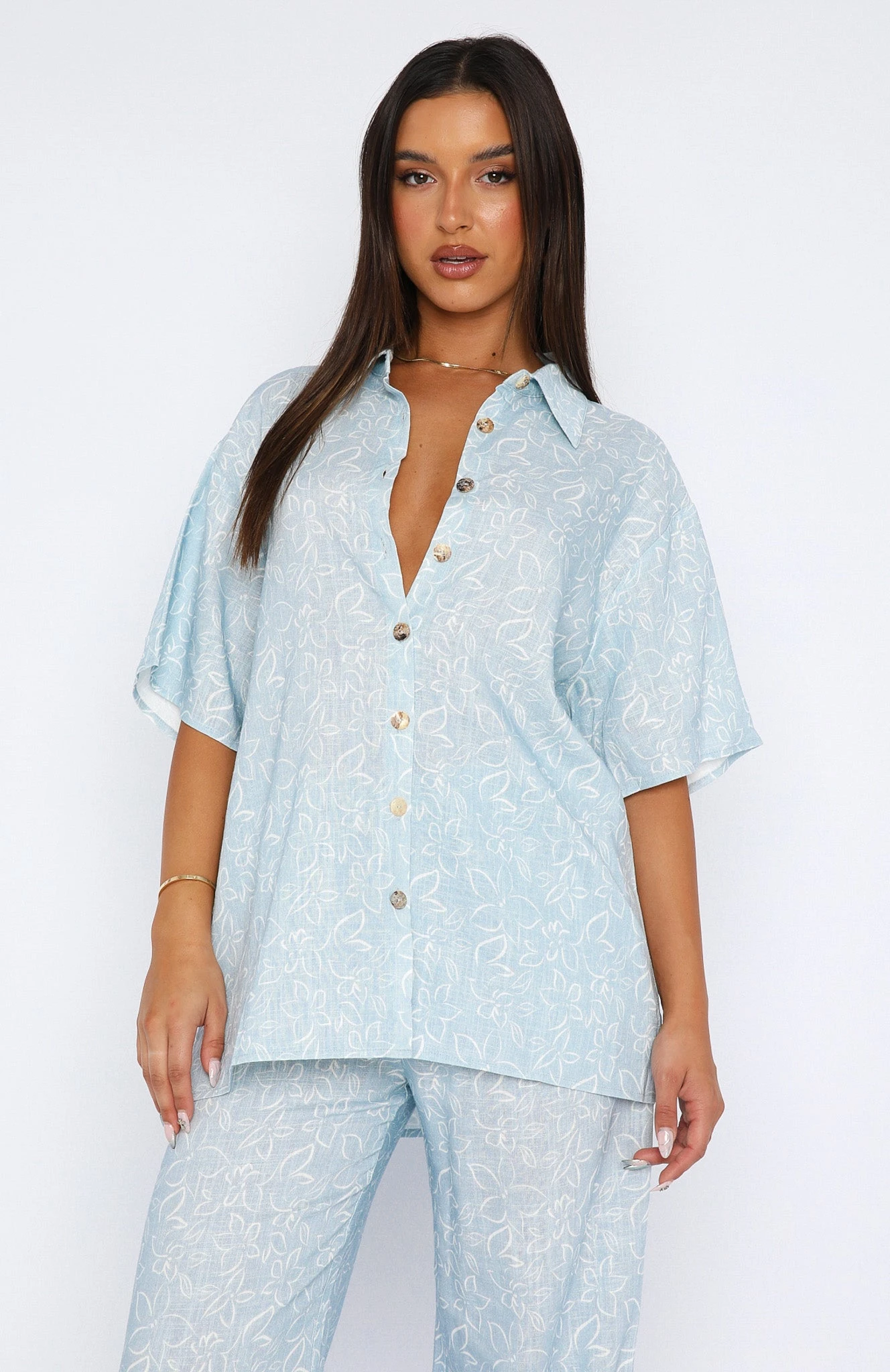 Add a fun print to your wardrobe with the One More Chance Shirt in Blue Floral Sketch. Featuring short sleeves, collared neckline, button closure and linen-feel fabric. We love this paired with the matching Need A Recap Pants and platform slides for a look that will cause compliments!Â