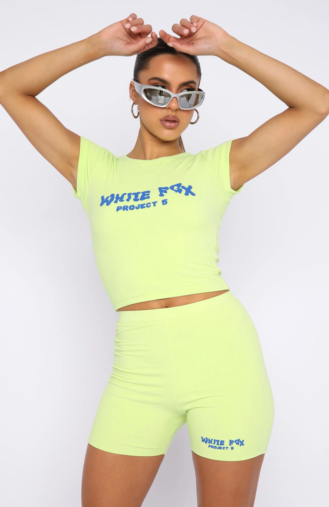 The Project 5 Ribbed Bike Shorts in Lime are your new chill day essential. Featuring an elasticated waist band, lined to avoid sheerness, soft stretch ribbed fabric and printed logo side front. We love this paired with one of the Project 5 sweaters/hoodies or baby tee for the perfect off-duty look.
